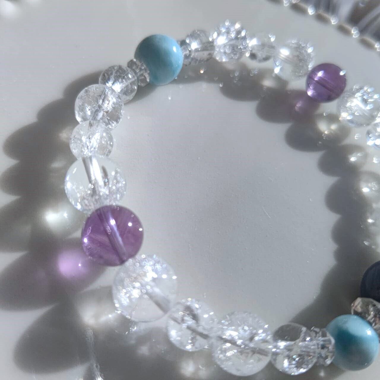 10mmカイヤナイトに、7mmと8mmのラリマー、ライトアメジストを合わせた癒しのブレスレットです。