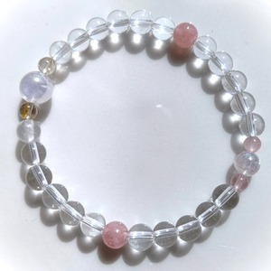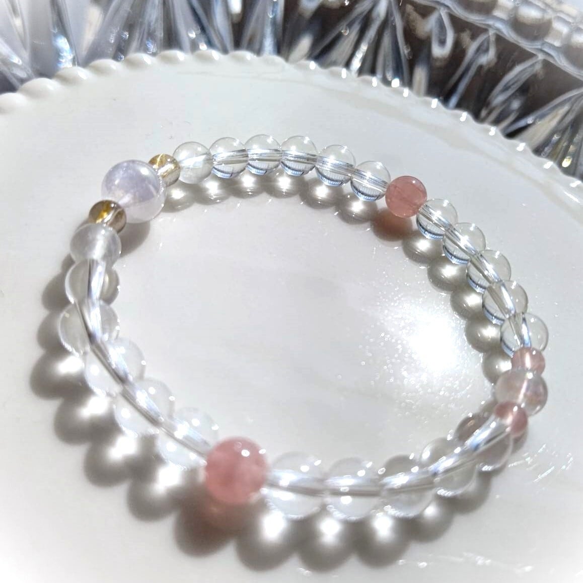 8mm珠ローズオーラをメインに、6mmブルームーンストーン、クリスタル、ディープローズクォーツを並べたパワーストーンブレスレットです。