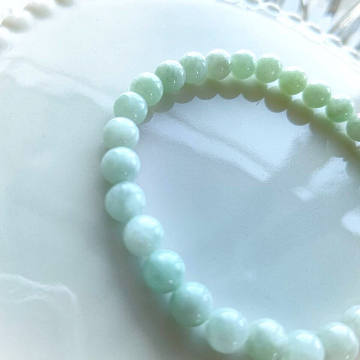 ミャンマー産本翡翠の6mm丸珠を使用した、繊細で美しいアイスグリーンのパワーストーンブレスレットとピアスのセットです。