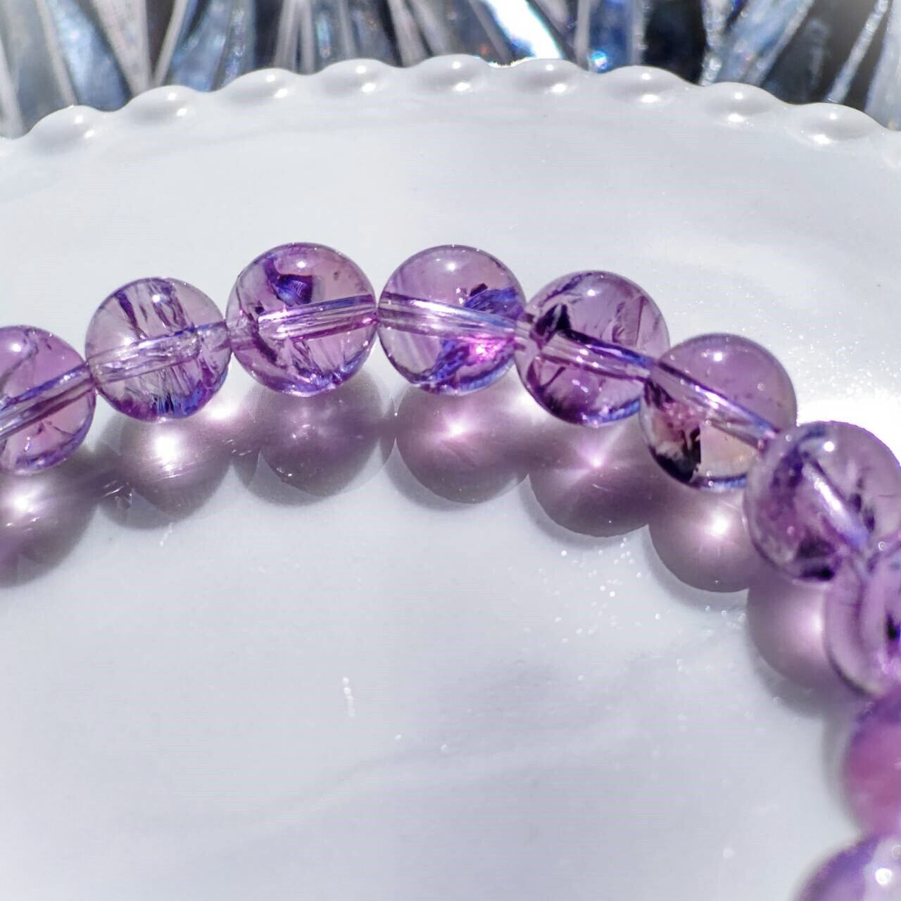 珠のなかに美しい虹の出る、アイリスラベンダーアメジスト8mm珠のパワーストーンブレスレットです。
