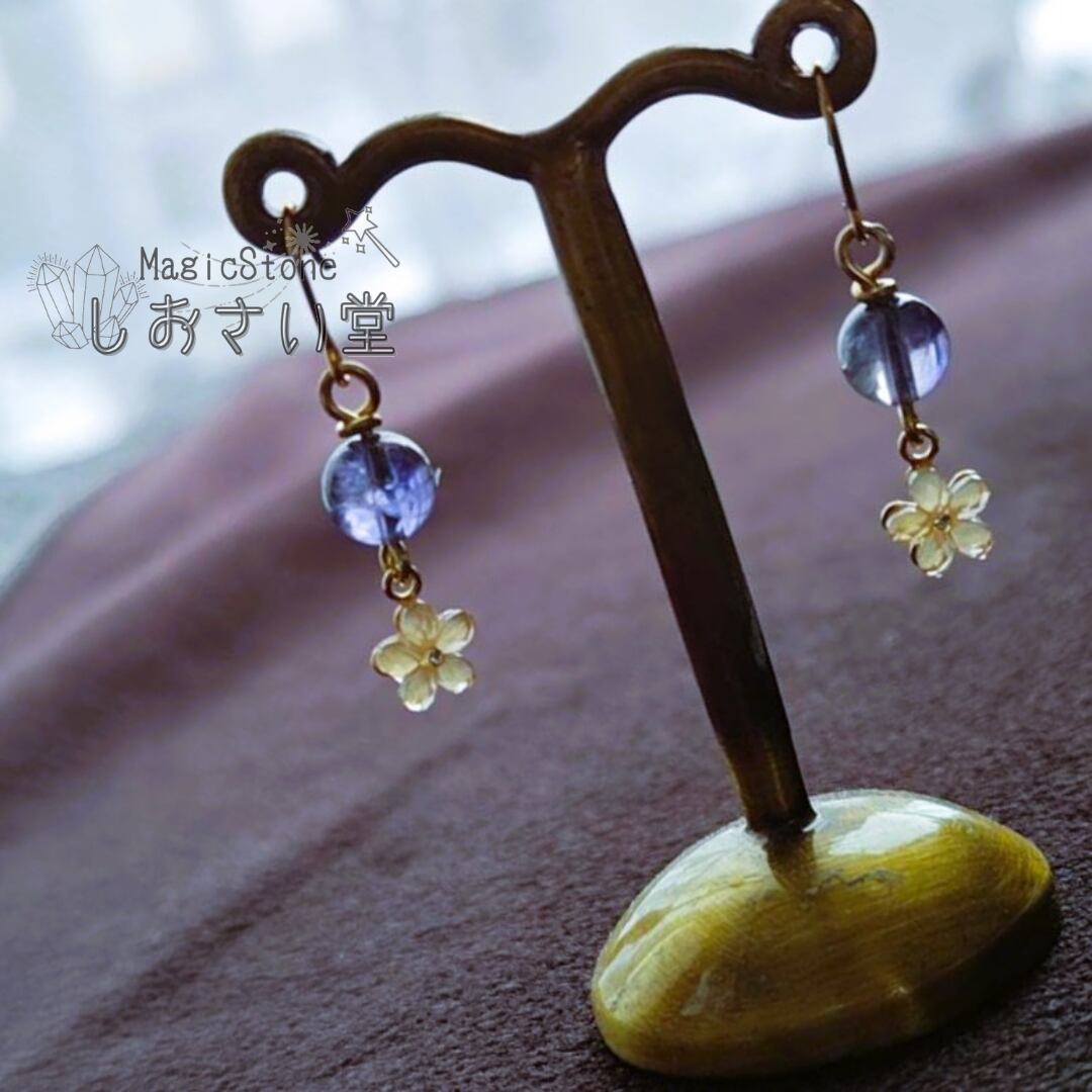 すみれ色の石「アイオライト」を用いた、ピンクのお花がキュートなピアス。