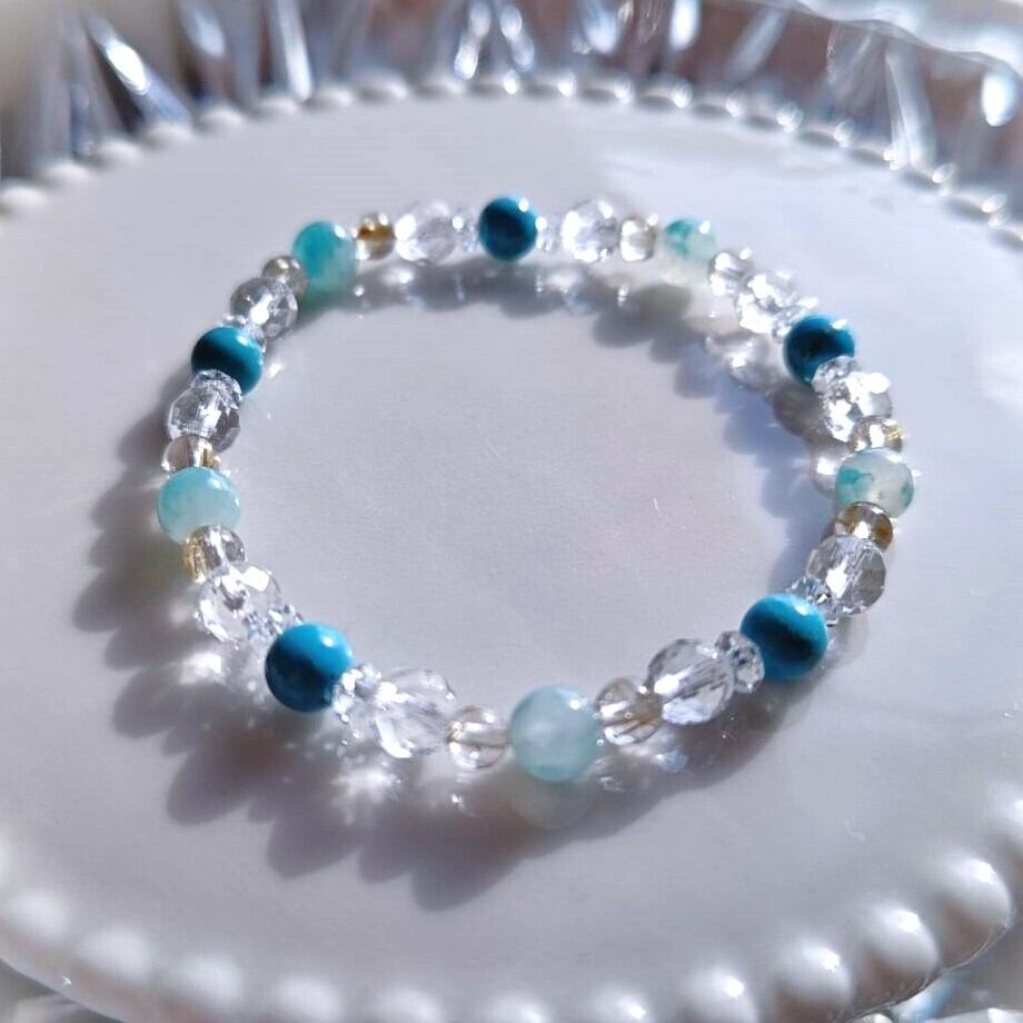 ターコイズ、タイチンルチルクォーツ、アマゾナイトインクォーツを用いた爽やかな色あいのパワーストーンブレスレットです。
