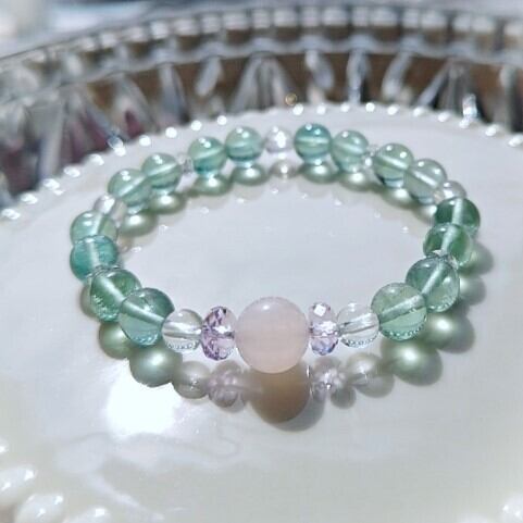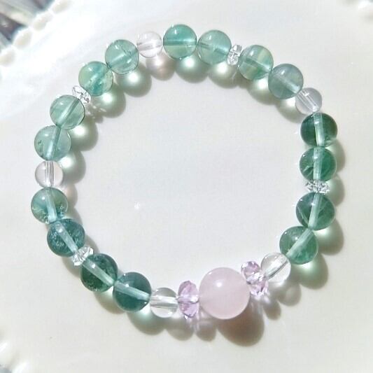 今回はブルーフローライト8ミリ珠をと、主石としてローズクォーツを使い、パワーストーンブレスレットに組み立てました。
