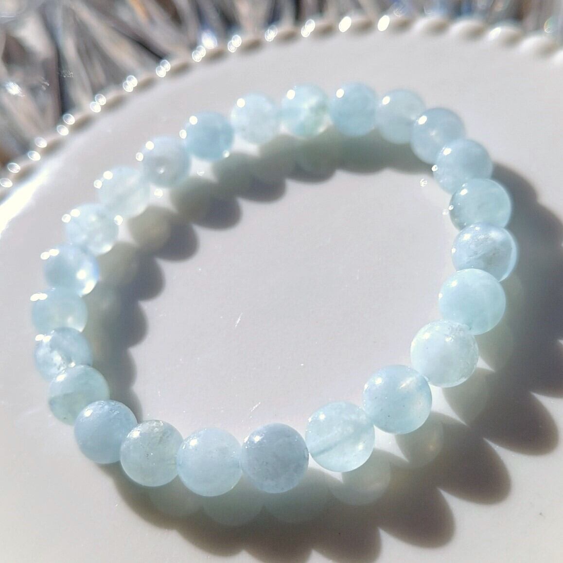 半透明4Aグレード、8mmのアクアマリンをシンプルに連ねた、爽やかな海のようなパワーストーンブレスレットです。